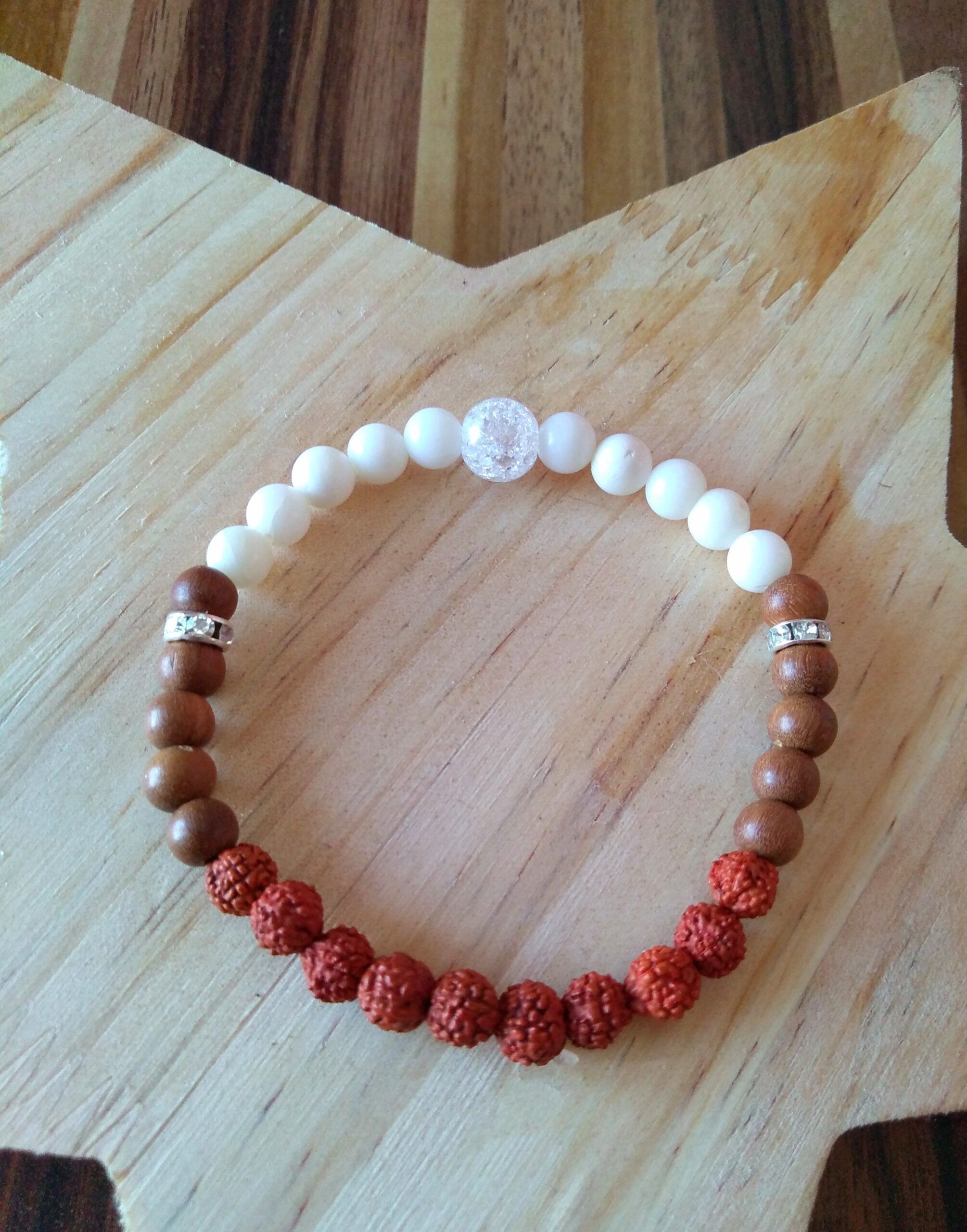 Rudraksha náramek – korálky ze semínek stále zeleného stromu , santalové dřevo, bílý korál, křišťál pukaný
